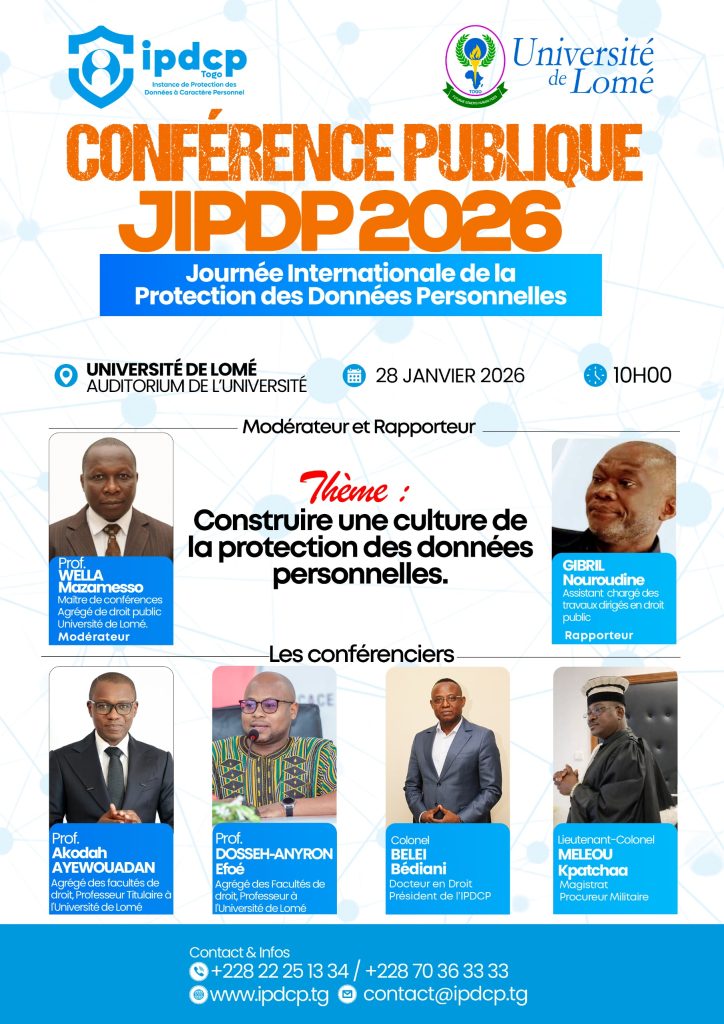 Au Togo, cette célébration sera marquée par l’organisation d’une conférence publique le 28 janvier 2026 à l’Université de Lomé, à l’initiative de l’Instance de Protection des Données à Caractère Personnel (IPDCP), en partenariat avec l’Université de Lomé. Cette rencontre se veut un cadre d’échanges, de sensibilisation et de réflexion sur les enjeux juridiques, institutionnels et sociétaux liés à la protection des données personnelles.
