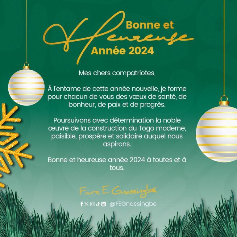“À l’entame de cette année nouvelle, je formule pour chacun de vous des vœux de santé, de bonheur, de paix et de progrès. Poursuivons avec détermination la noble œuvre de la construction du Togo moderne, paisible, prospère et solidaire auquel nous aspirons. Bonne et heureuse année 2024 à toutes et à tous », a posté le président sur ces comptes sociaux.