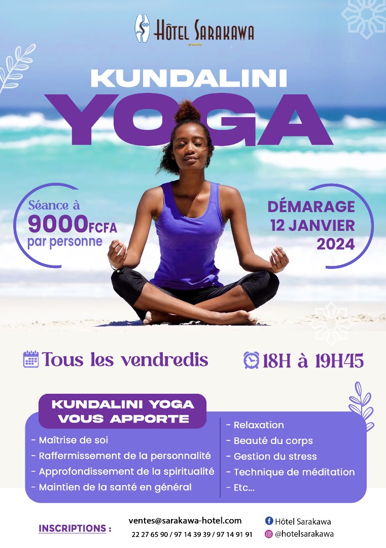 Koundalini Yoga qui est une technologie holistique puissante qui travaille sur les différents plans de l’être .Il vous apporte la maitrise de soi, le raffermissement de la personnalité, l’approfondissement de la spiritualité, le maintien de la santé en général, la relaxation, la beauté du corps,la gestion du stress ,la technique de méditation etc.