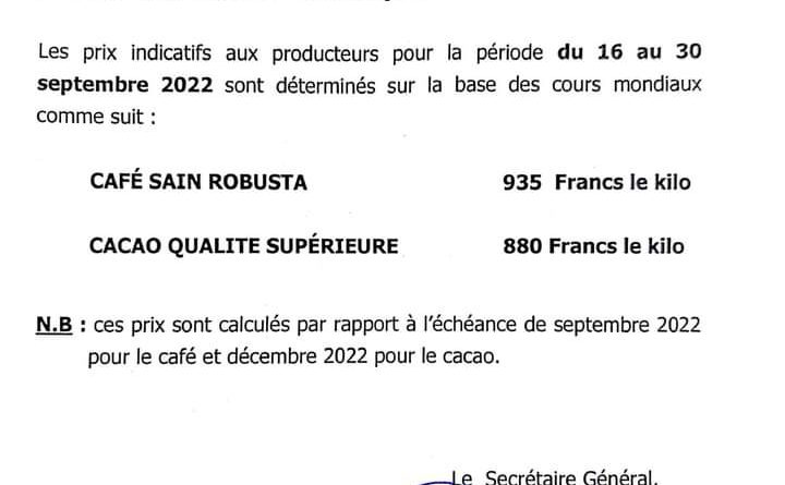 Booster la production et transformer localement le café –cacao togolais est l’une des ambitions du gouvernement qui affiche un ferme engagement à atteindre ses objectifs. C’est d’ailleurs à juste titre que le secrétaire général du comité de coordination a fixé les prix indicatifs aux producteurs pour la période du 16 au 30 septembre 2022.Ses prix sont déterminés comme suite